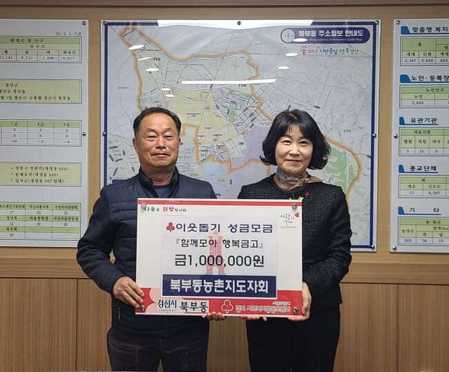 경산시 북부동 농촌지도자회(회장 안병훈)는 지난 11일 북부동행정복지센터를 방문하여 관내 취약계층을 지원하는 데 사용해 달라며 이웃돕기 성금 100만 원을 기탁했다.