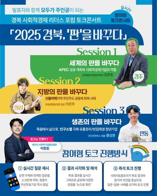 경상북도는 사회적경제의 미래 비전과 실천 전략을 공유하기 위한 경북 사회적경제 리더스 포럼 토크콘서트 ‘2025 경북, 판을 바꾼다’ 를 개최한다고 밝혔다.