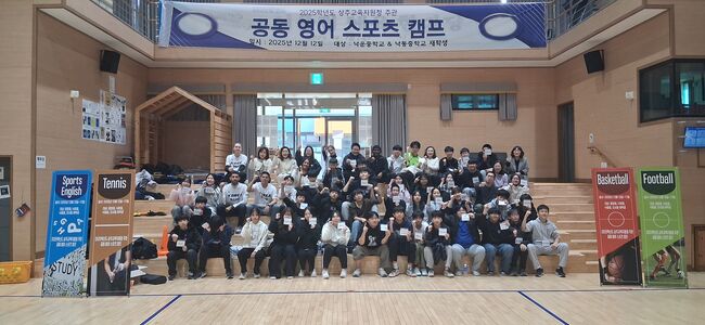 낙운중학교와 낙동중학교 학생들이 체육관에서 열린 ‘2025학년도 소규모 학교 영어 스포츠 캠프’에 참여해 원어민 강사들과 함께 단체 기념촬영을 하며, 공동 교육과정 운영의 성과를 나누고 있다.낙운중학교(교장 양혜선)는 지난 12월 12일, 낙운중학교 운동장과 체육관에서 ‘2025학년도 소규모 학교 영어 스포츠 캠프’를 성공적으로 운영했다고 밝혔다.