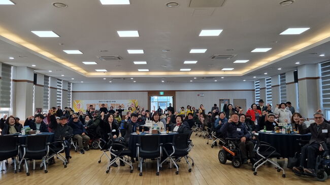 2025년 ‘장애인 화합 작은 음악회’에 참석한 시민과 회원들이 함께 화합의 마음을 나누며 환한 미소로 기념 촬영을 하고 있다. 행사는 색소폰 공연으로 문을 열었으며, 음악을 통해 서로의 마음을 나누는 문화 프로그램이 이어졌다. 특히 이날 함께 진행된 ‘사랑의 햅쌀 전달식’은 행사에 의미를 더했다.