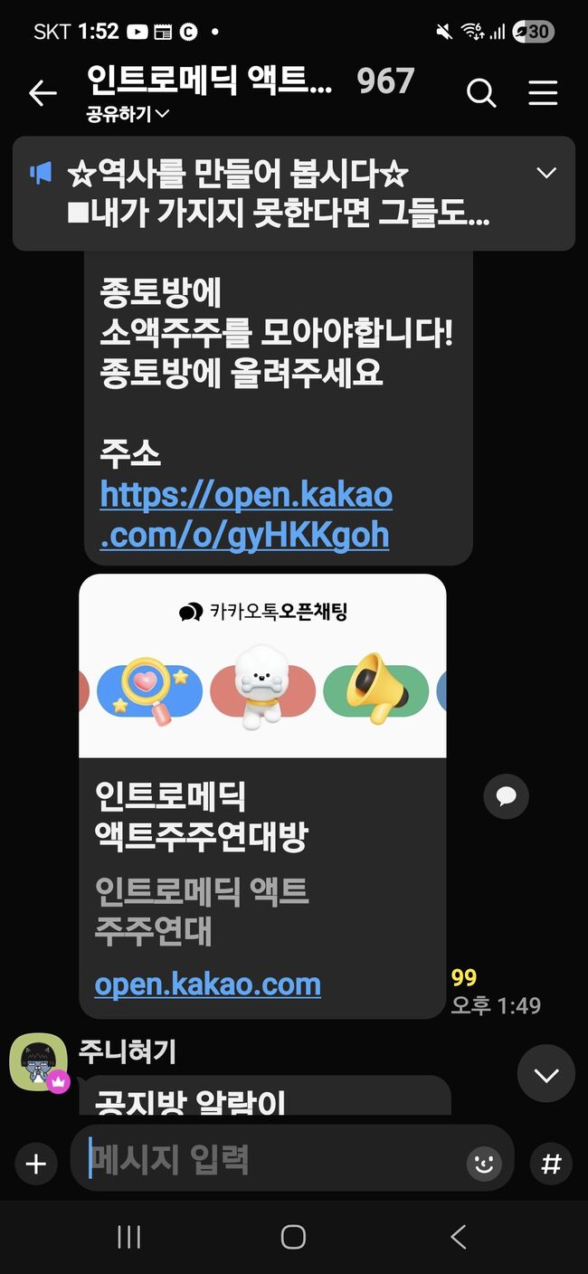 인트로메딕 소액주주 연대 오픈채팅방 안내 화면연간 매출 100억 원 규모의 의료기기 전문기업 인트로메딕이 회계감사 과정의 착오로 거래정지된 뒤, 재감사를 통해 ‘적정’ 의견을 받았음에도 불구하고 경영진의 무능과 경영권 분쟁으로 재상장에 이르지 못하면서 그 피해가 고스란히 소액주주들에게 전가되고 있다.
