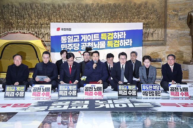 19일 오전 서울 여의도 국회 로텐더홀에서 통일교 게이트 특검법 및 민주당 공천뇌물 특검법 수용을 촉구하는 단식농성장 앞에서 장동혁 당대표 주재로 최고위원회의가 열리고 있다.