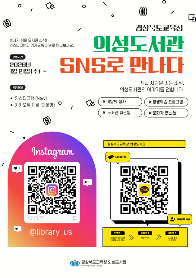 한편, 의성도서관 인스타그램(@library_us)과 카카오톡 채널 ‘의성도서관’을 통해 도서관 소식과 프로그램 정보를 확인할 수 있으며, 팔로우와 채널 추가를 통해 다양한 정보를 받아볼 수 있다.