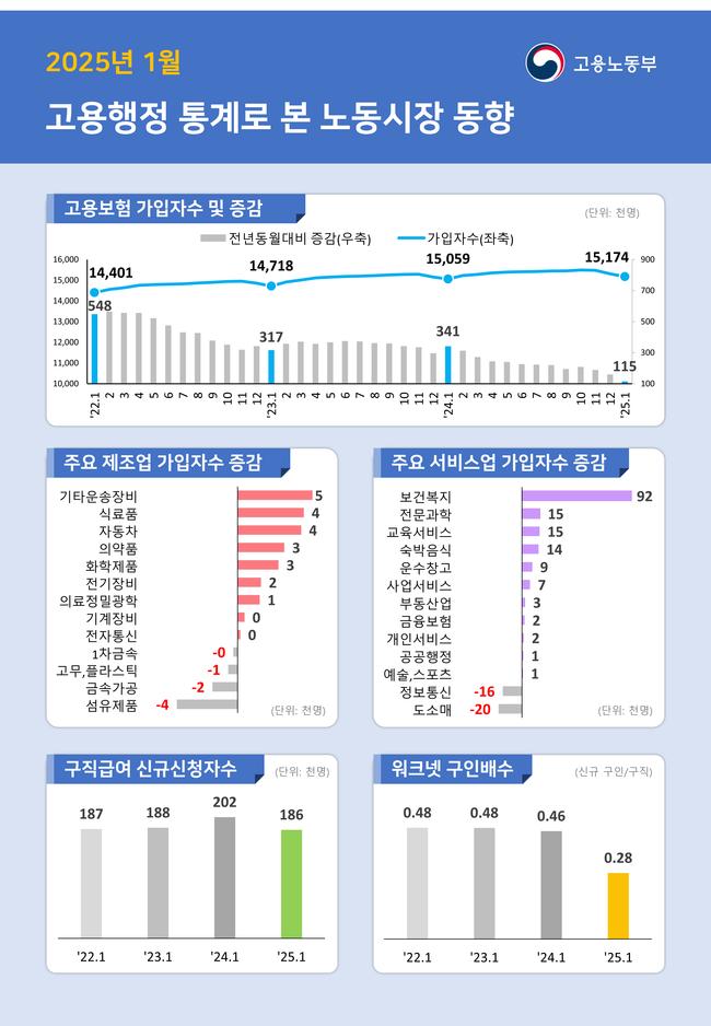 고용노동부가 10일 발표한 ‘2025년 1월 고용행정 통계’에 따르면, 1월 말 기준 고용보험 가입자는 1,517만 4천 명으로 전년 동월 대비 11만 5천 명(0.8%) 증가한 것으로 나타났다.