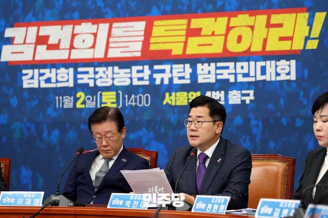 더불어민주당 박찬대 원내대표는 10월 31일 오전 국회 본청 원내대표회의실에서 긴급 기자회견을 열고, 윤석열 대통령이 불법적으로 공천에 개입했다는 육성 증거를 확보했다고 주장했다. 사진은 지난 10월28일 더불어민주당 최고위원회의 모습.