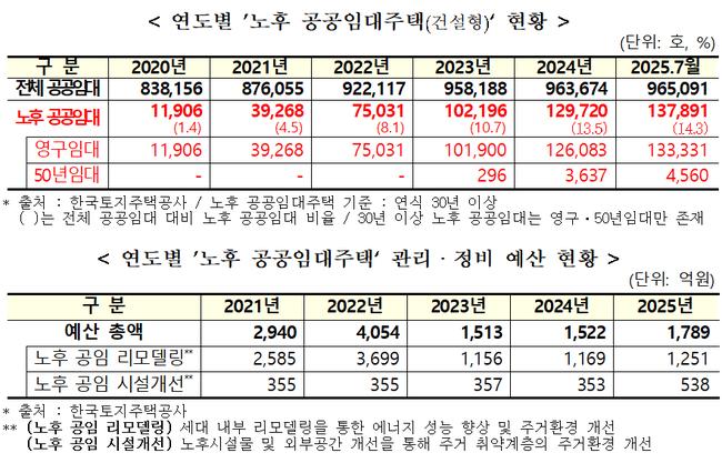 그러나 정부의 노후 공공임대 관리·정비 예산은 급증하는 노후 주택 수를 따라가지 못하고 있다. 2022년 4,054억 원이던 관련 예산은 2023년 1,513억 원으로 대폭 삭감된 뒤, 2024년 1,522억 원, 2025년 1,789억 원으로 제자리걸음을 하고 있다.