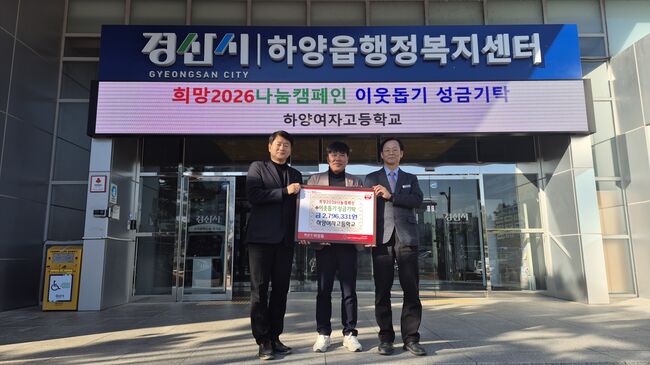 이날 성금 전달식에 함께한 이영석 하양읍장은 “지역사회를 생각하는 교장선생님과 학생들의 따뜻한 마음에 깊이 감사드린다”며 “기탁해 주신 성금은 어려운 이웃을 위해 소중히 사용하겠다”고 전했다.