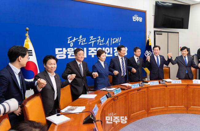 정청래 당대표가 2026.02.11.(수) 국회 본청 당대표회의실에서 열린 최고위원회의를 시작하기에 앞서 지도부 모두가 서로의 손을 잡고 인사를 하고 있다. 정청래 더불어민주당 대표는 11일 오전 서울 여의도 국회 본관 당대표회의실에서 열린 제222차 최고위원회의 모두발언에서 지방선거 전 합당 논의 중단과 선거 후 통합 추진 방침을 공식화하며 “이제 오직 지방선거 승리를 위해 우리의 큰 같음을 바탕으로 총단결하겠다”고 밝혔다.