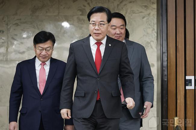 10일 오전 송언석 원내대표와 원내대표단이 서울 여의도 국회 회의실에서 열리는 원내대책회의애 참석하기 위해 가고 있다.